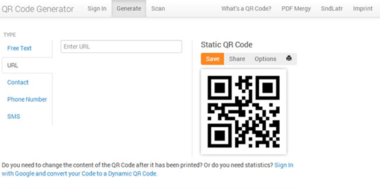 Yet another online QR code generator that is absolutely free of cost. It generates black white QR Codes and also allows free tracking, free SMS, v-Cards and static codes to name a few. The only drawback is that the content of the respective QR code cannot be changed soon after it’s generated.
