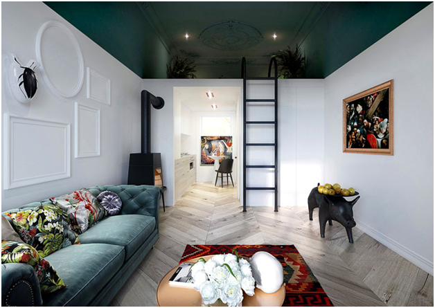 The Elegant Suite is the best example of a studio apartment with an uncompromised interior design. They paid more attention to the upholstered furniture and materials used to come up with the design. The interior design reveals the direction of where to go because of the amazing flooring pattern and the colors of the wall. The deep sea green bedroom color blends well with white designated for the common spaces. You can Shop furniture online to find your perfect balance of comfort and style.