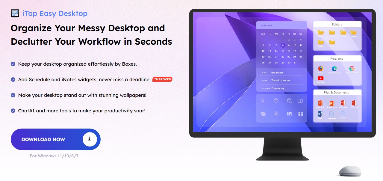 A messy desktop slows you down. It wastes time and adds stress. iTop Easy Desktop fixes that. It sorts files fast, organizes with boxes, and hides distractions. You can lock private files and search quickly. Fun designs keep you inspired. Handy widgets make tasks easier. These tips make your desktop a better place to work. Download iTop Easy Desktop now. Get your desktop clean and work better today!