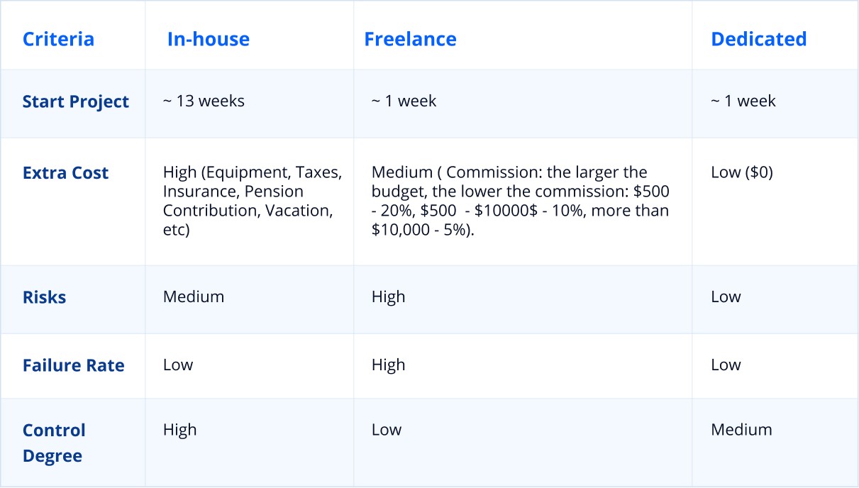 Similarly to freelance developers, the choice is not limited by a geographical region when looking for a dedicated developer. It increases the chance to find a more suitable professional.