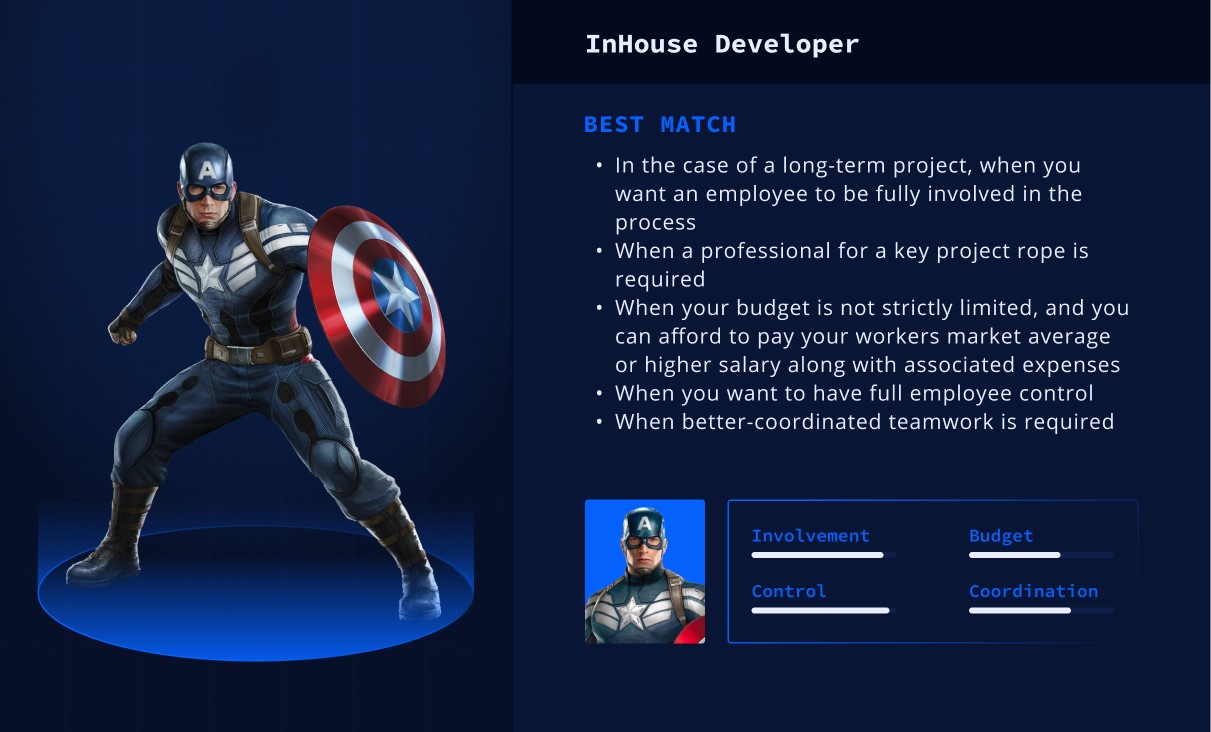 Raising and training an employee is another great opportunity of having an in-house team. Being part of a team a person learns from teammates and can get feedback fast. It is quite a feasible option to hire a junior and make a savvy senior when this person is an InHouse developer.