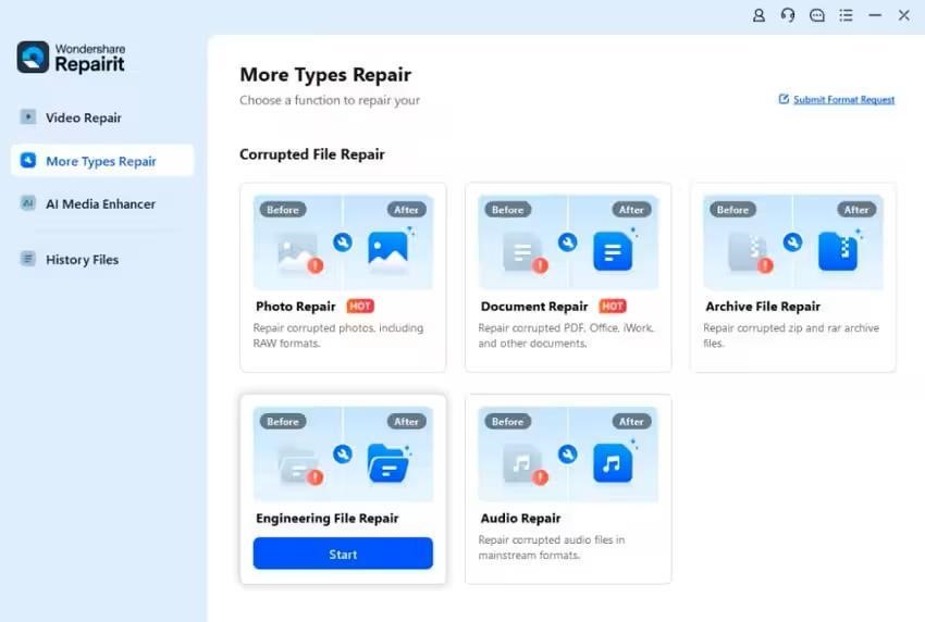 Once you enter the main interface, press the “More Types Repair” option in the left menu and hit the “Start” button in the “Engineering File Repair” tool.