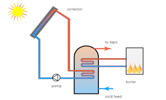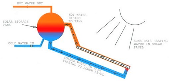 The heated liquid from the solar panels transmits its calories to the water as it passes through a coil in the storage tank. An additional gas or electric powered coil in the tank will heat the water if the solar panel cannot maintain the desired temperature or sustain demand.