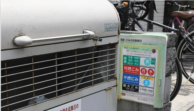 Trash cans under the apartment building in Shibuya, Tokyo, Japan, June 4, 2019. The sign indicates the recycling time of all types of garbage. Japan has very detailed and strict regulations on the classification and treatment of domestic garbage.